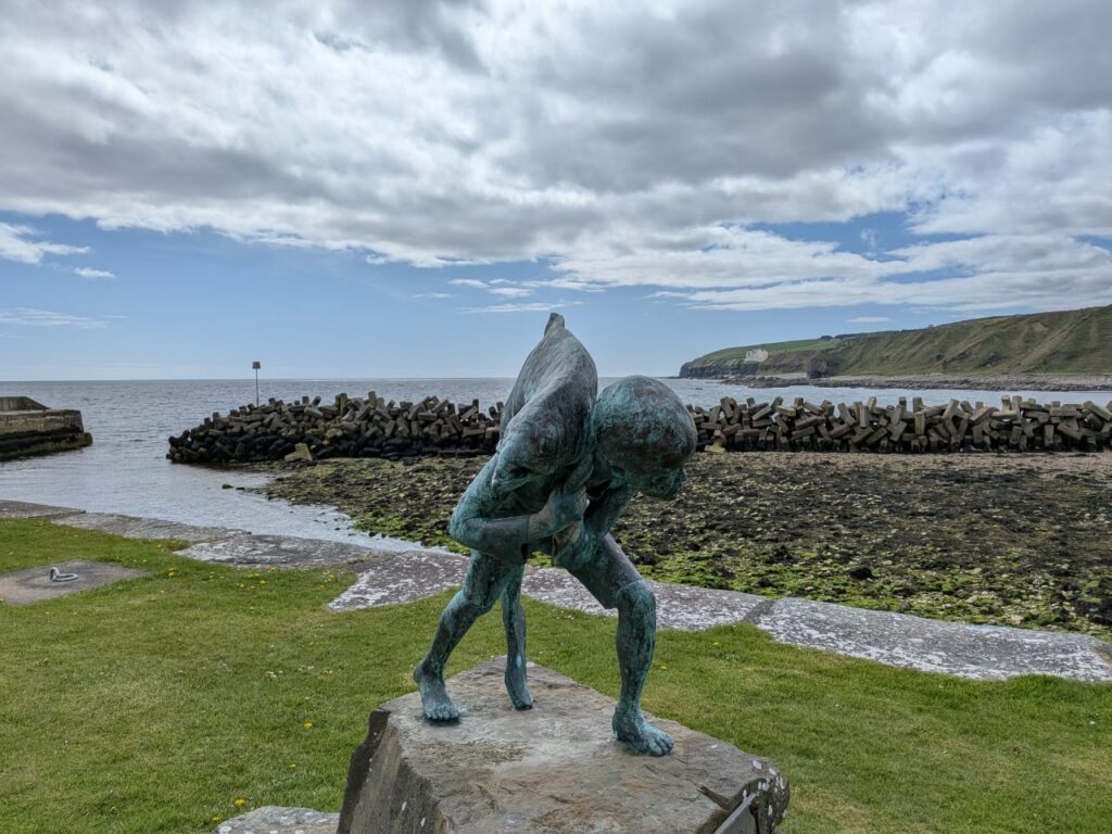 Nous filons à Arbroath, on souhaite goûter les fameux smokies (des harengs, maquereaux et autres saumons péchés et fumés sur place lorsqu’ils sont encore bien frais). Ophélie jette son dévolu sur du saumon dans un pain beurré. Pour ma part ça sera le smokie classique, réchauffé.