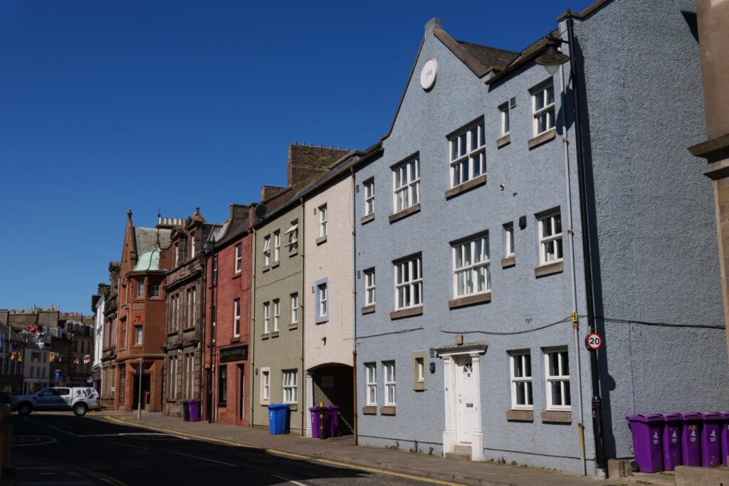 Les jolies maisons colorées du port invitent à la flânerie, mais pas la météo, très incertaine. Nous en profitons pour aller visiter les charity shop, des petites boutiques de seconde main genre Emmaüs chez nous. Si vous voulez un service à thé de type victorien pour la modique somme de pas grand chose, c’est là qu’il faut chiner !