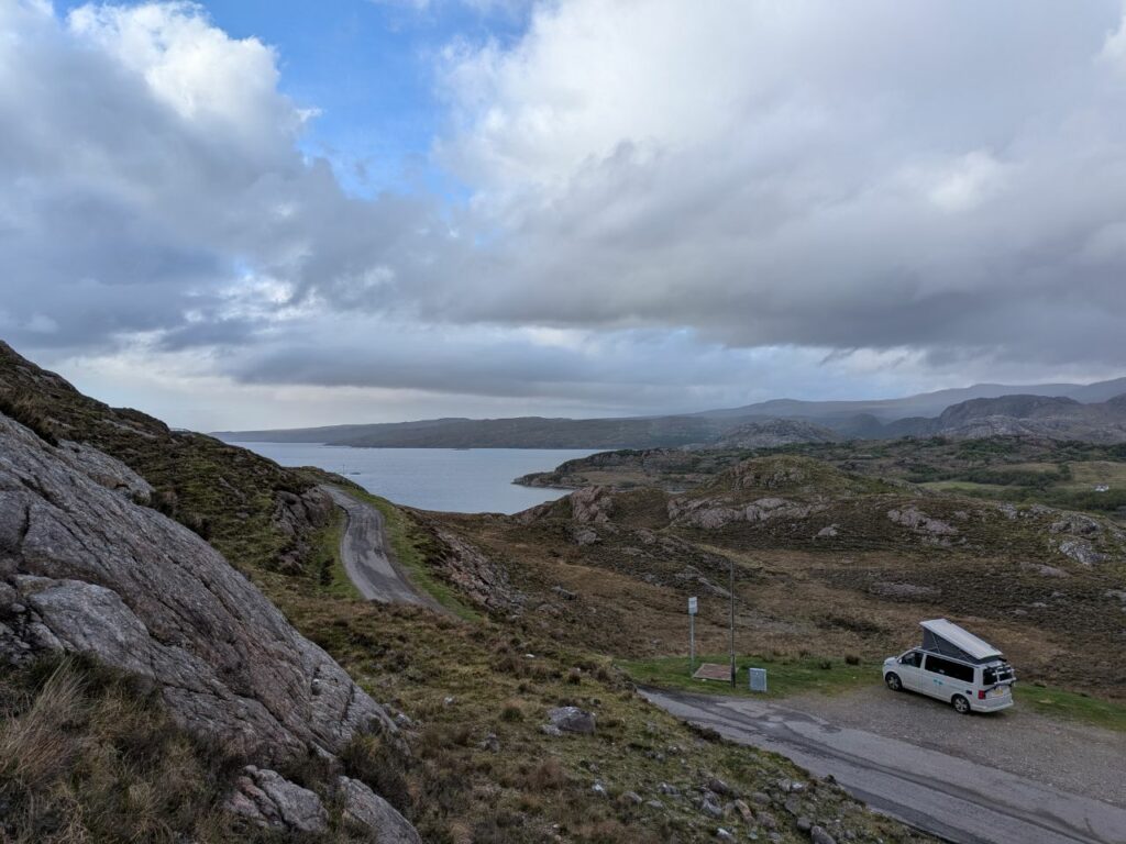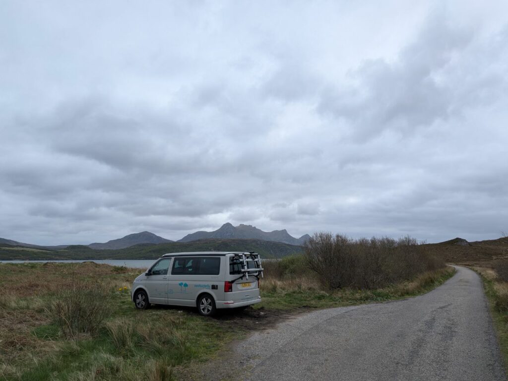 Retour sur la terre ferme. Nous nous préparons un casse-croûte dans le van avant de repartir. Cet après-midi nous longerons la côte nord (passage par Durness) puis nous nous arrêtons le long d’un bras de mer, sur la route qui mène à Tongue. Cette nuit nous dormirons face au Ben Loyal. Un sommet rocailleux et dépouillé, on dirait la montagne maudite dans le seigneur des anneaux !