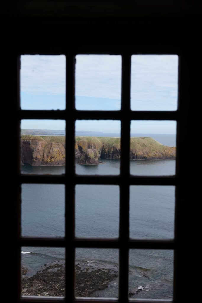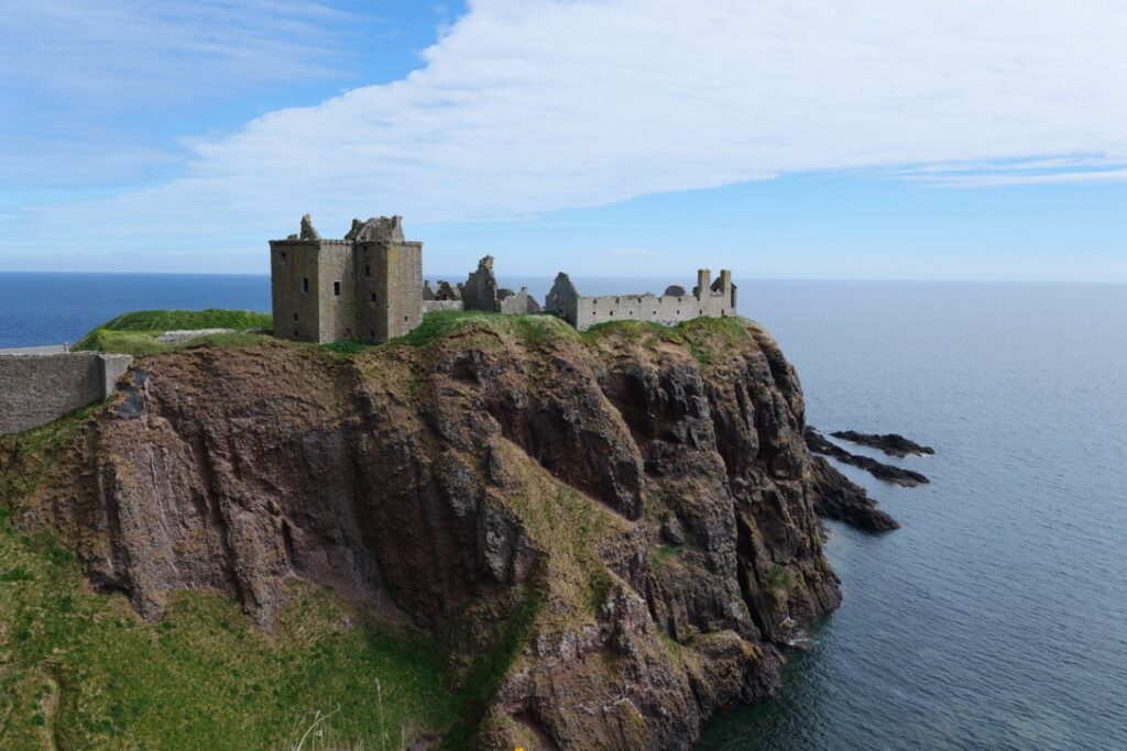 Le château de Dunnottar est perché sur un rocher dans une large crique, une fine langue de terre permet d’y accéder et de le défendre facilement pour les occupants. Il fut le théâtre de nombreux sièges et batailles entre anglais et écossais.