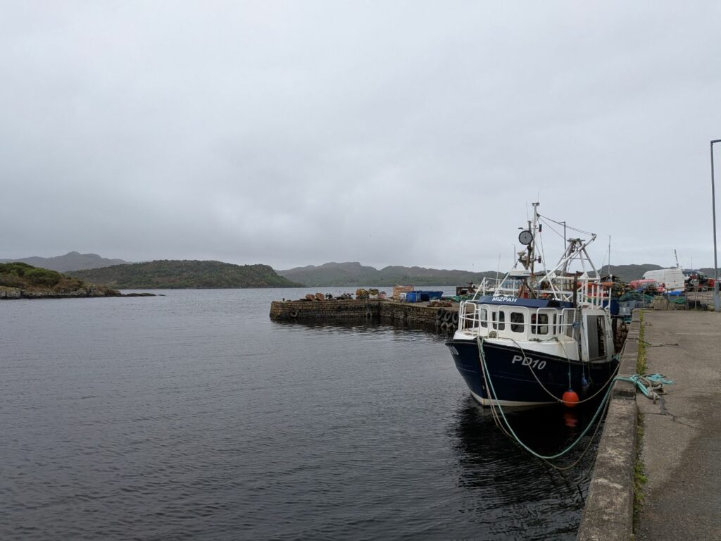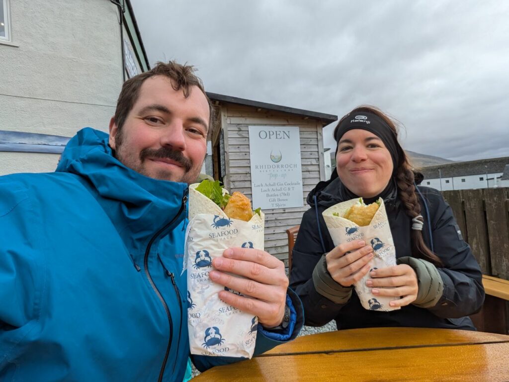 Nous roulons jusqu’à Ullapool, une grosse bourgade (plusieurs rues quoi) avec un port de pêche industrielle et un quai pour ferry. La météo est absolument affreuse, ce qui n’empêche pas d’engloutir sous une météo incertaine un « tempura battered haddock » dans un wrap. Super bon, le haddock est frais de la pêche locale, la portion est copieuse, 12£ bien dépensées !