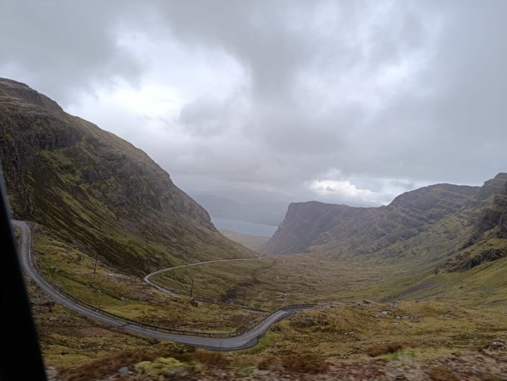 Cap ensuite sur la Bealach Na Ba road, considérée comme la plus belle route d’Écosse (probablement à juste titre). On sert un peu les fesses car c’est encore une single track road, donc impossible de se croiser hors « passing place » dont je vous ai parlé. Évidemment le revêtement est conforme aux chaussées précédentes, nids de poule, trous, bas côté défoncé, ça rajoute un peu de piquant à la conduite !