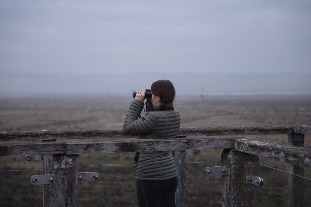 Un oiseau est en train de récolter des bourgeons de coton dans la tourbière à côté du van pour probablement, lui aussi, se nicher dans un nid douillet.