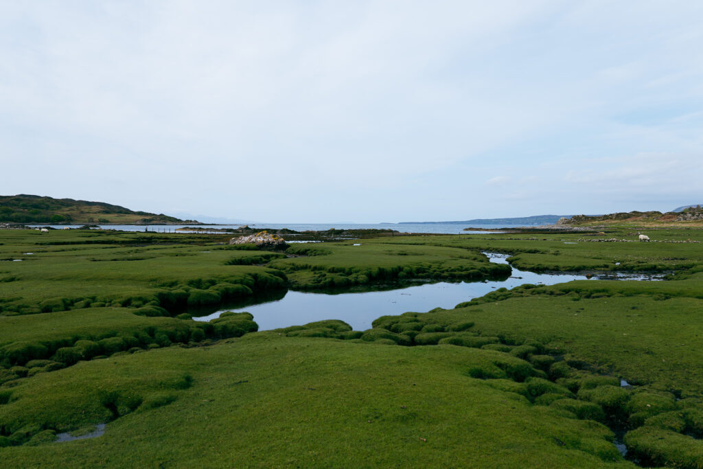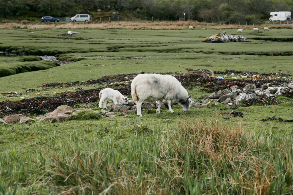 Nous profitons également du lieu pour un petit dej attablés sur une langue d’herbe verte, entourés de moutons broutant une pâture qui semble être un pré salé.