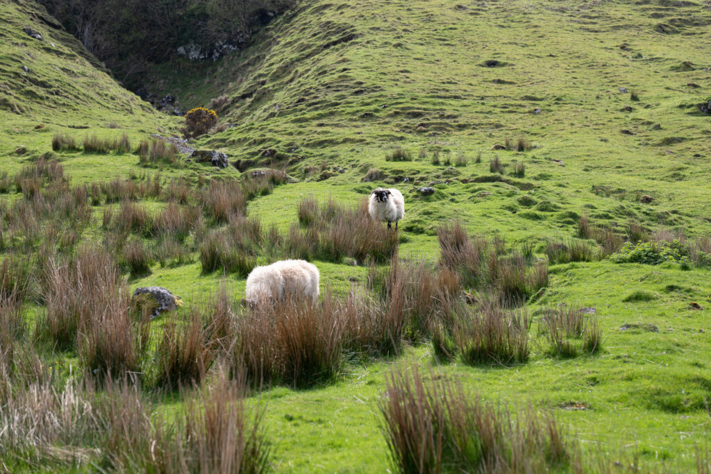 Nous reprenons ensuite la route pour la plage de Talisker, nichée au creux d’une vallée encadrée par deux montagnes d’où s’écoulent des cascades, des prairies, et des moutons !