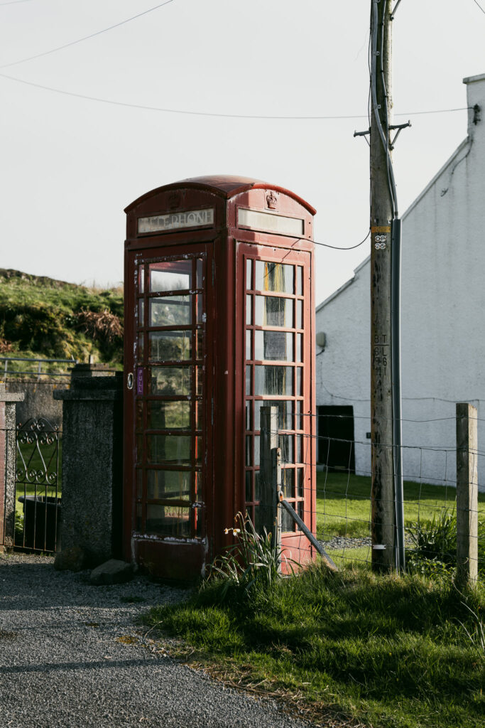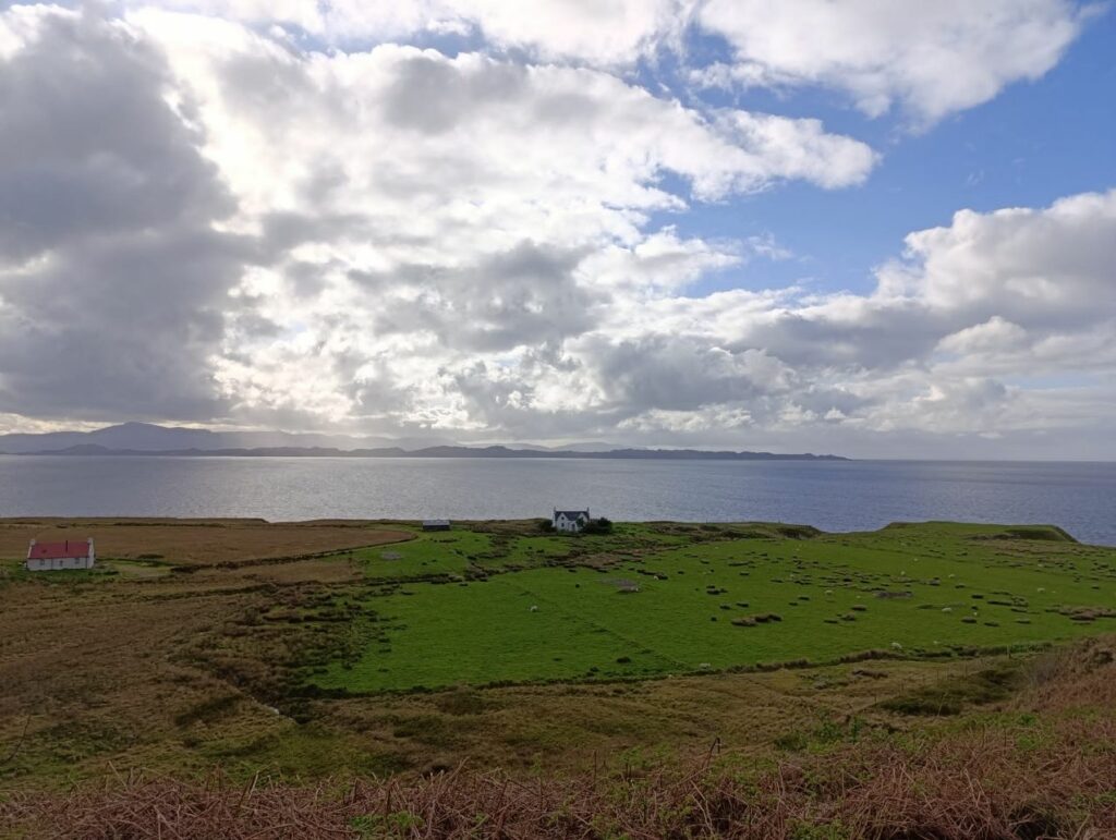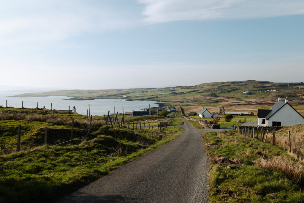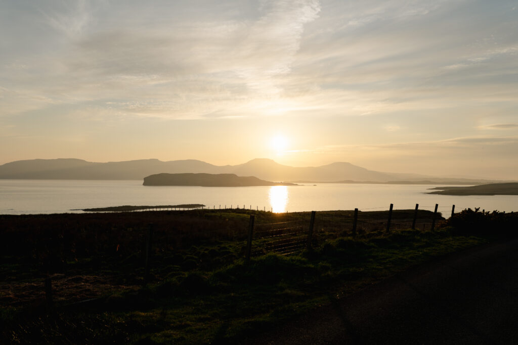 Ce soir, nous jetons notre dévolu pour la commune d’Ullinish, quelques maisons blanches le long d’une route quasi déserte, qui font face à l’océan et à quelques îles inhabitées.