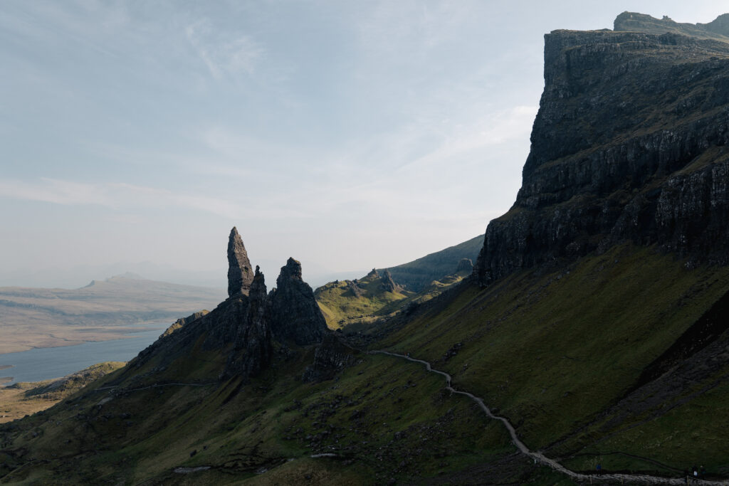 Nous poursuivons jusqu’à l’un des hauts lieux touristiques de l’île : the old man of Storr ! Une randonnée qui nous mène au pied du sommet « the Store » dans un chaos rocheux dont le monolithe (old man) nous observe pendant notre progression. Ce sont des coulées de lave datant de 6 millions d’années puis l’erosion des glaciers par la suite qui ont dessinés cet environnement.
