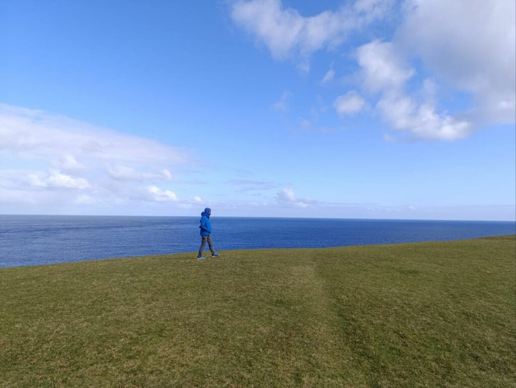 Falaises ici aussi avec des vues à couper le souffle sur les îles, les plages, les pâtures vertes, et, de nouveau, des centaines d’oiseaux et de pingouins.