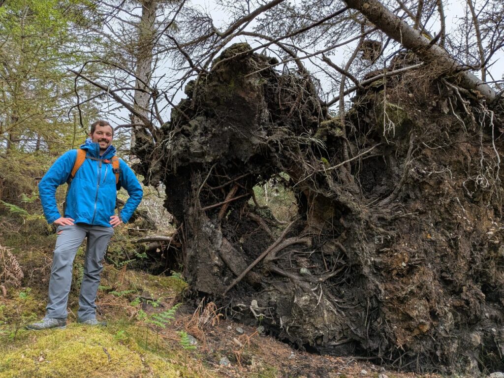 Peu avant notre arrivée à Lochinver, on repère un petit parking qui semble nous appeler pour une balade. Bingo, en plus il ne pleut plus ! Il y a un plan réalisé par les élèves de l’école locale pour se repérer dans le « bois de Culag » : quoi ? On a pris un convoi arctique pour l’URSS sans faire gaffe ?