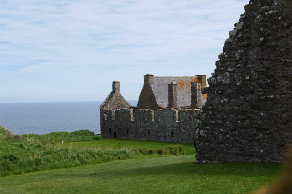 Nous repartons en direction de la côte pour visiter le château de Dunnottar en traversant la campagne écossaise et ses pelouses tondues et taillées au cordeau ! Les jardins ressemblent à des green de golf, pas génial pour la biodiversité mais très satisfaisant. D’ailleurs nous l’avons remarqué les jours précédents, au moins rayon de soleil, la valse des tondeuses démarre. Cela nous fait penser à la jungle qu’on va retrouver en rentrant chez nous.